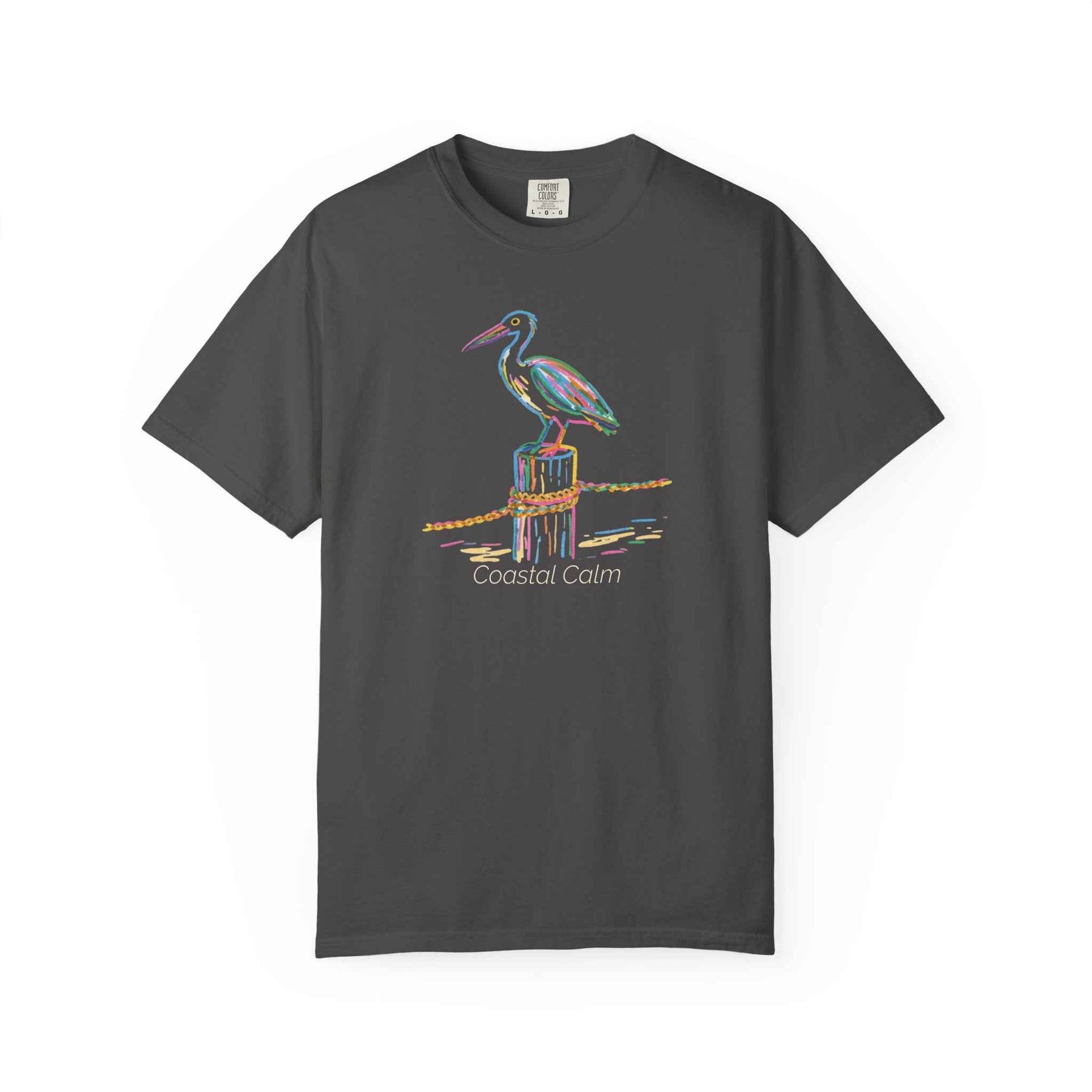 Coastal calm meets worn-in comfort in this garment-dyed tee. A painterly heron perches on a weathered piling, rendered in soft, sun-faded colors that pop against the muted, vintage wash of the shirt. The heavyweight cotton feels substantial but broken-in from the first wear — the kind of tee you reach for on slow mornings, beach walks, and whenever you want a quiet, seaside moment. Relaxed through the body with a sewn-in label and durable double-needle stitching, it wears like a favorite you’ve had for years while keeping its shape and color wash after wash.
