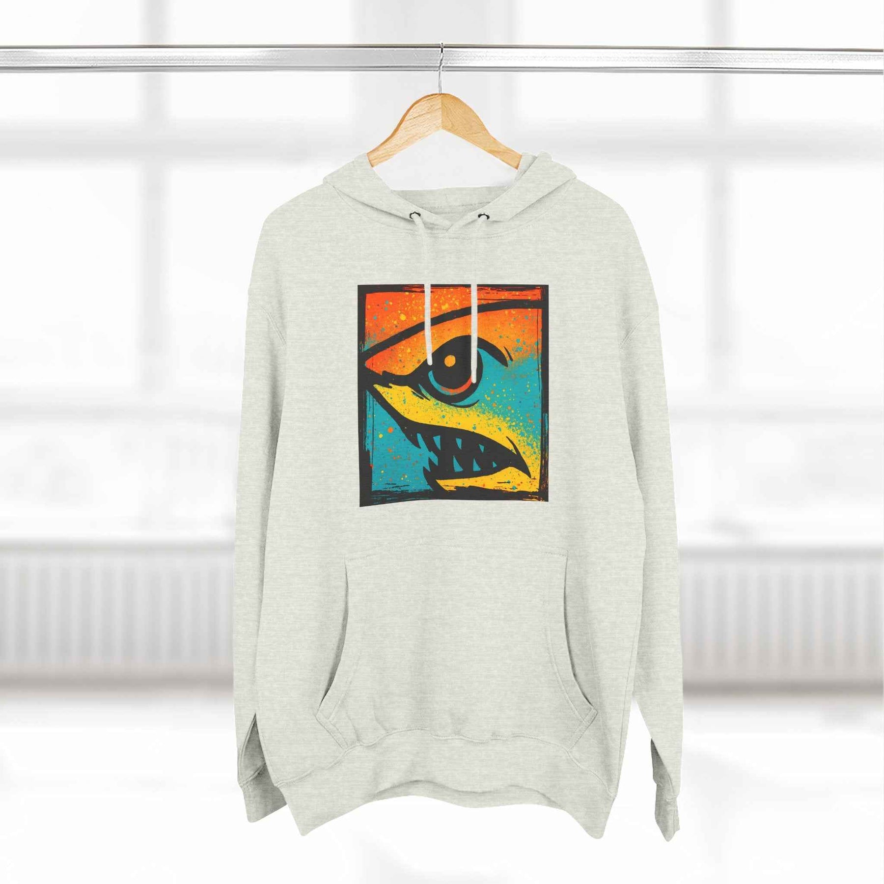 Some graphics command attention — and this one earns it. The Shark Eye Illustrated Fleece Hoodie features a vivid three-panel artwork: sunlit orange fading into ocean teal, with a stylized fish eye and jaw that hints at surf, sea, and sunset adventures. It reads like a weathered poster on a midweight fleece that holds shape and warmth without feeling bulky.