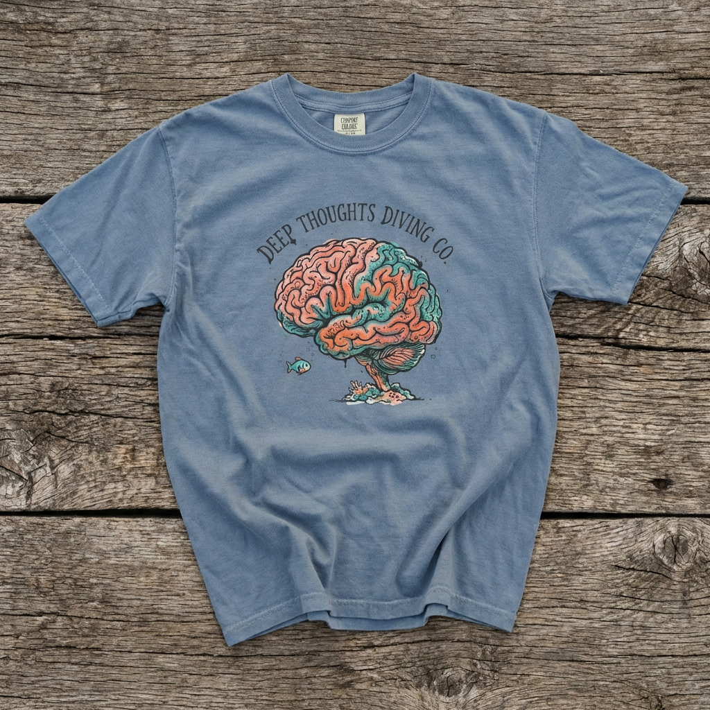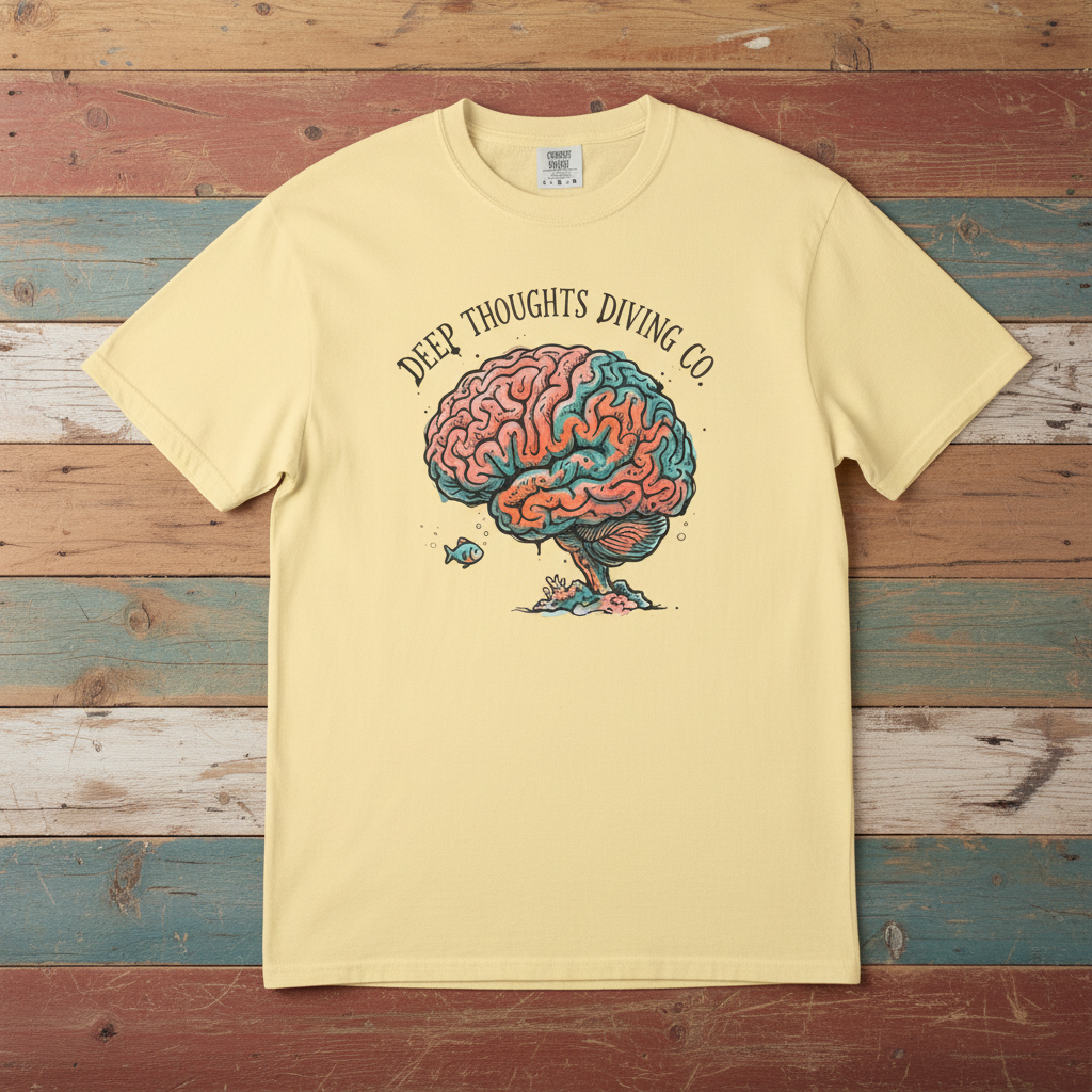 Some shirts carry a quiet story. This garment-dyed heavyweight tee features a hand-illustrated coral brain tree — a mind shaped like a reef, with tiny fish drifting through its folds and "Deep Thoughts Diving Co." arching above. It's the kind of graphic that rewards a second look: part science, part surrealism, all coastal soul.