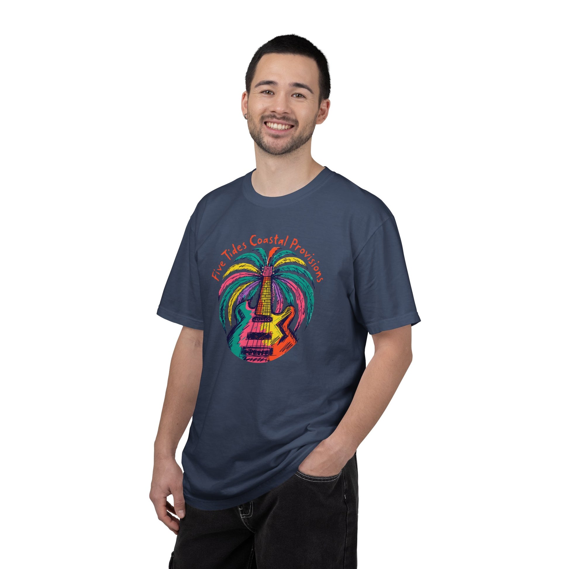 A relaxed, garment-dyed tee that feels like an instant favorite. The soft, heavy-weight cotton and worn-in color come together with a hand-drawn, coastal-inspired graphic — a rainbow acoustic guitar forming the trunk of a palm, colorful waves spilling out in painterly strokes. It’s the kind of shirt you pull on for long drives with the windows down, beach bonfires, or slow afternoons at a seaside market. The roomy, relaxed fit and sturdy double-stitched seams mean it wears well through repeat washes and adventures, while the pre-shrunk, tubular construction keeps the silhouette clean and comfortable. Available in many colors and sizes, this tee reads laid-back, artistic, and lived-in — a quiet companion for people who value texture, color, and easygoing style.