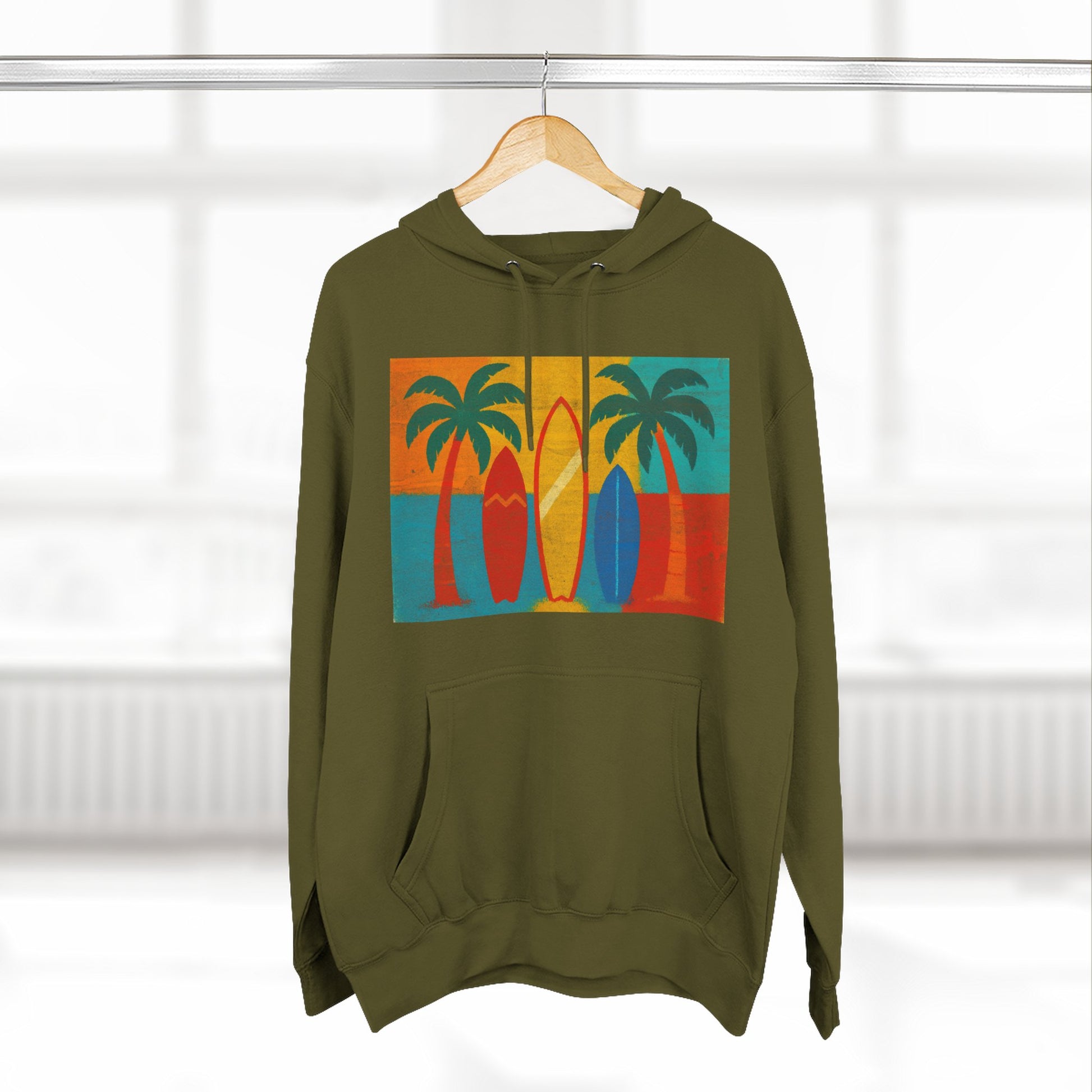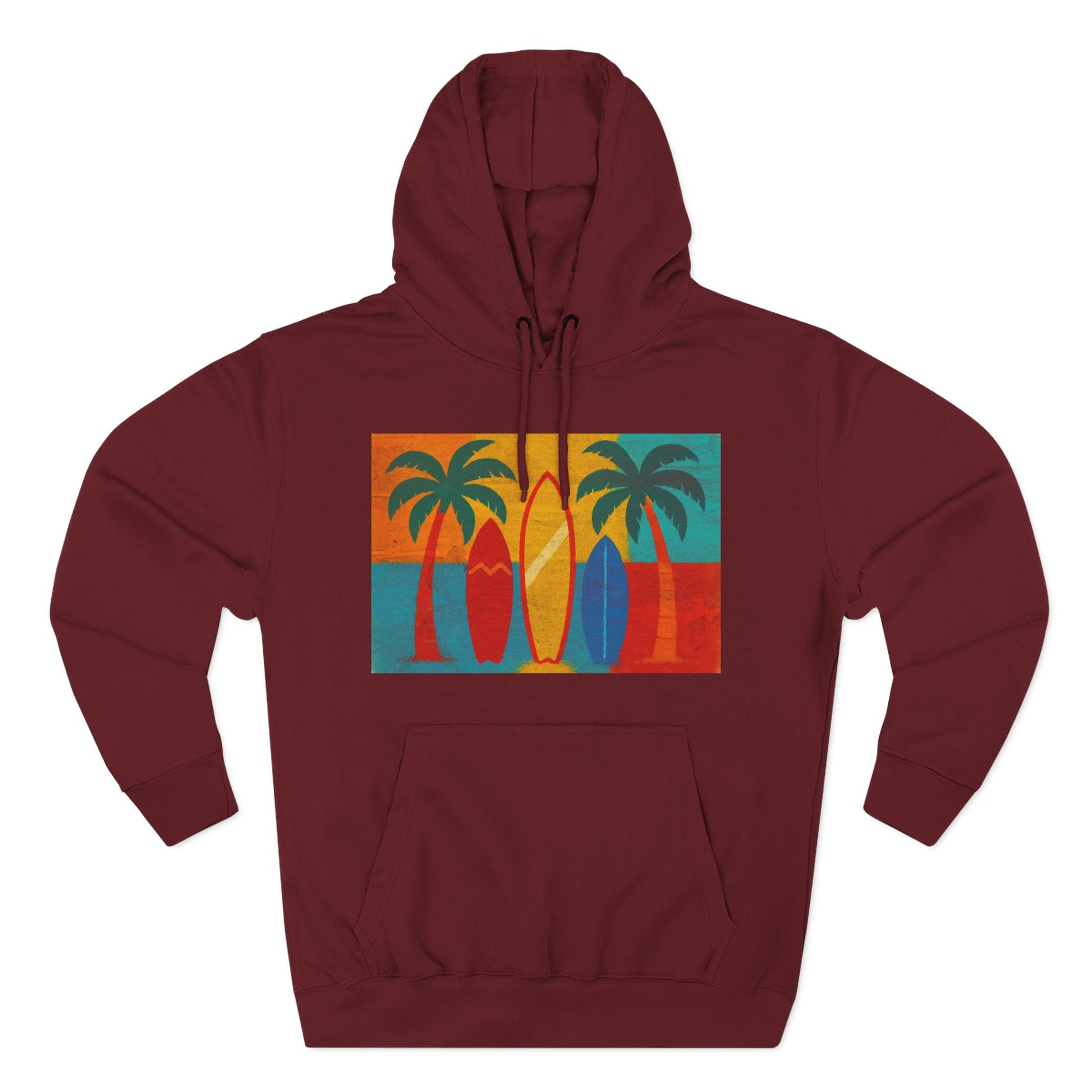 Surfboard Palm Tree Caribbean Hoodie — Retro Beach Graphic Pullover