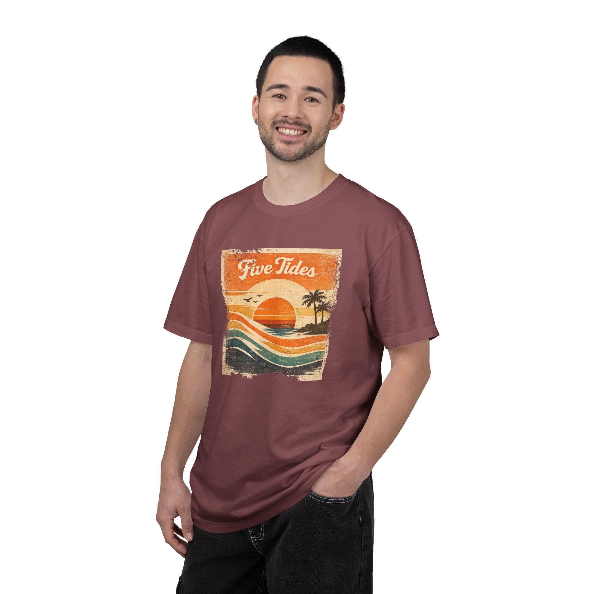 Vintage Beach Sunset Graphic Tee - Five Tides Coastal Surf T-Shirt